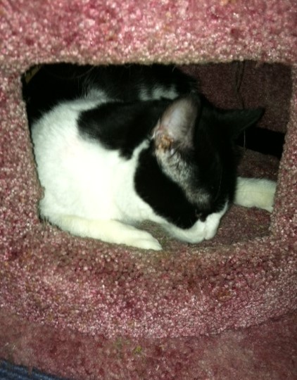 His favorite places are the pillow that Charlotte used to sleep on, and this kitty condo. It hasn't had a cat in it for at least five years.